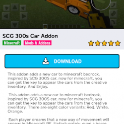 هذا Cars mod for minecraft pe يجلب السيارات والحافلات والدبابات وأيضًا سيارات السوبر في لعبة minecraft pe world (pocket edition) الآن يمكنك تنزيل السيارات التي تحبها مثل ferrari أو audi r8 أو ربما بوجاتي؟ ، يمكنك الحصول على سيارة وزارة الدفاع ل mcpe للمفتاح لتظهر السيارات من المخزون الإبداعي.